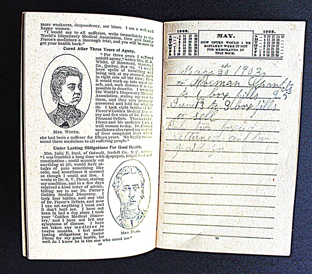 “May 30th 1903 to Norman Grant to 1 box pills 25c June 13th to 3 box pills to sell July two boxes of pills returned and two paid for” Research: Silvia does have an Uncle Norman Grant.