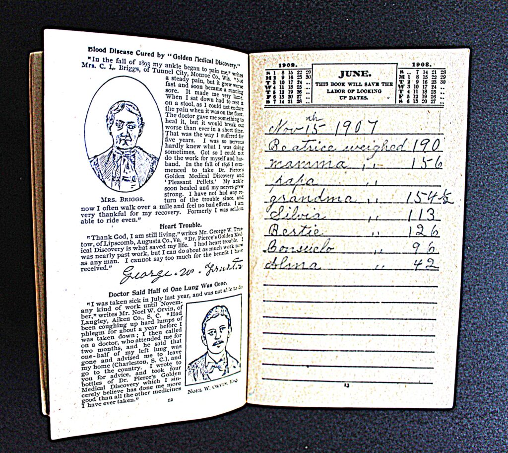 “Nov 15th 1907 Beatrice weighted 190; mamma ” 156; papa ” : grandma ” 154 1/2; Silvia ” 113; Bertie ” 126; Consuelo ” 96; Alma “42 ”