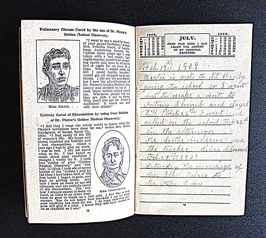 “Feb 19th 1909 Bertie is out to Mt Hanly going to school so I went out to make a visit to Antony Slocomb and stayed till Feb 26th. I went and called on the school Feb 22st in the afternoon. Mr. Sester was the teacher. Silvia Slocomb. Feb 27th 1909 Saturday the marriage of Miss Ethel Pierce to Mr. Miles Boone.” Research: Silvia had a 1st cousin, Anthony Slocomb.