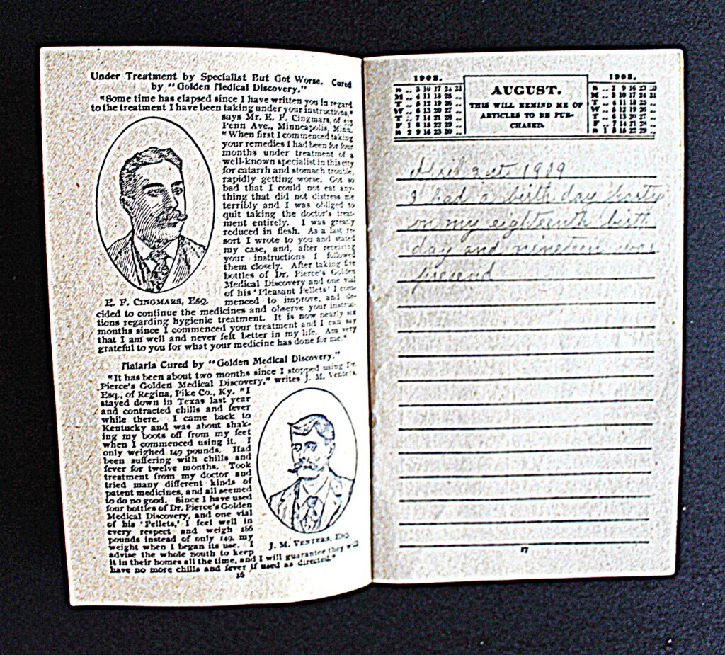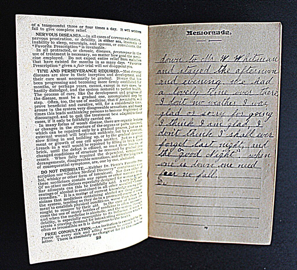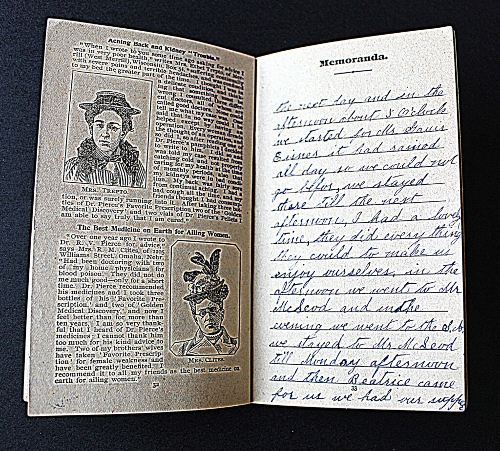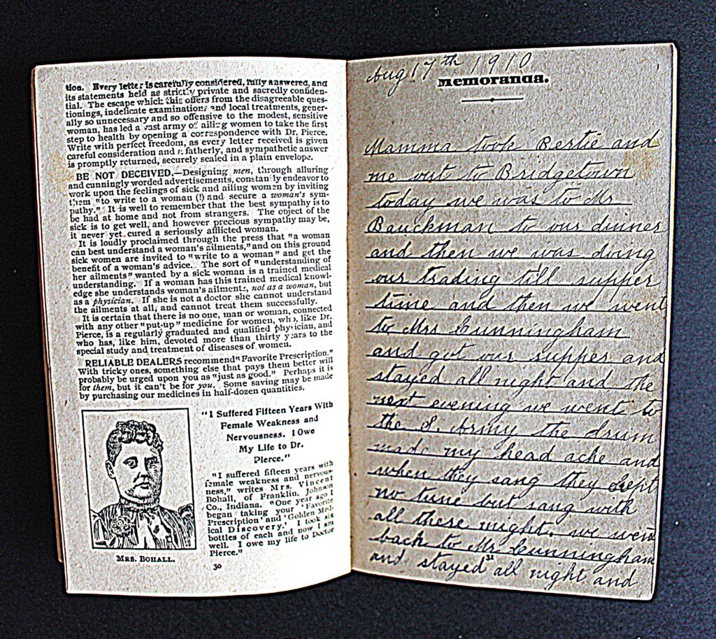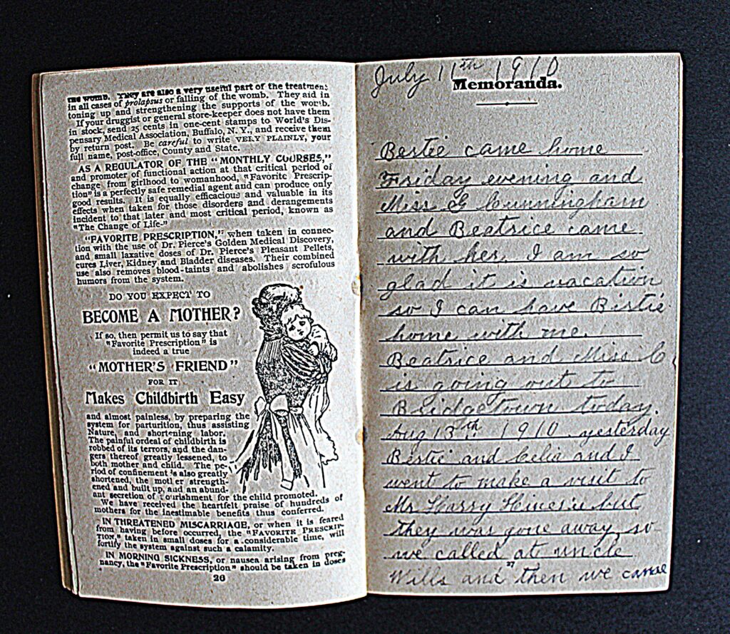 “July 11th 1910 Bertie came home Friday evening and Miss G. Cunningham and Beatrice came with her. I am so glad it is vacation so I can have Bertie home with me. Beatrice and Miss C. is going out to Bridgetown today; Aug. 13th 1910 Yesterday Bertie and Celia and I went to make a visit to Mr. Harry Hines’es but they was gone away, so we called at uncle Wills and then we came down to Mr. W. Whitman and stayed the afternoon and evening. We had a lovely time over there. I don’t no weather I was glad or sorry for going. I think I am glad, I don’t think I shall ever forget last night, and the “good Night”. When one is down one need fear no fall.”
