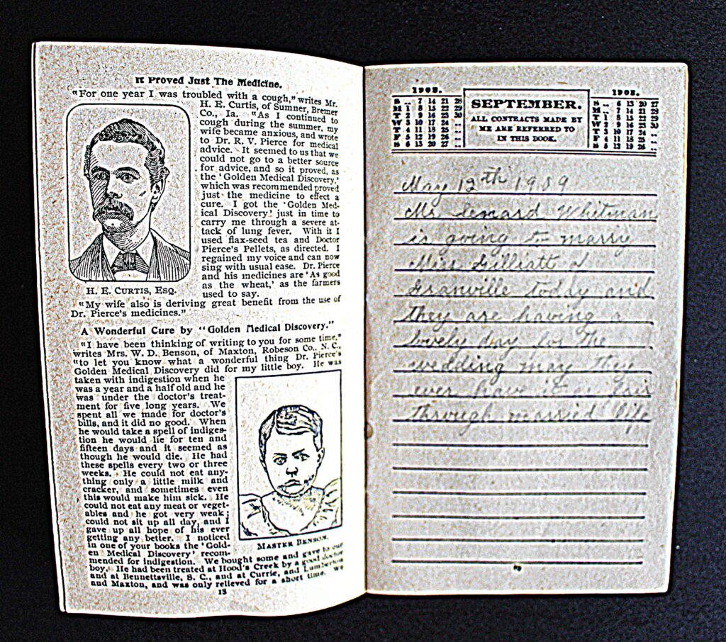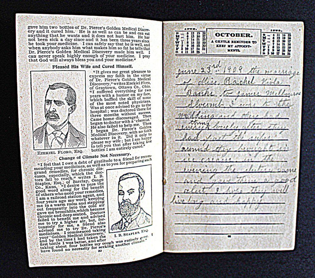 “June 23rd 1909 The marriage of Miss Rachel Viola Banks to James Melbourne Slocomb. I was to the wedding and they had everything lovely, after they had past the super around they brought in ice cream. In the evening the _______? came and gave them a good _____?. I hope they will live long and happy. Research: James M. Slocomb was Silvia’s 1st cousin.