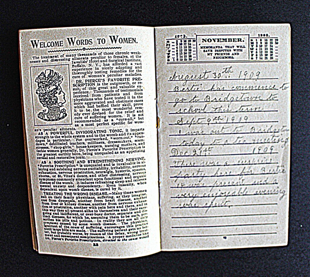 “August 30th 1909 Bertie has commence to go to Bridgetown to school this term; Sept. 9th 1909 I was out to Bridgetown today to a tea meeting; Dec. 21st 1909 There was a surprise party here for Bertie 14 was present and a very enjoyable evening was spent.”