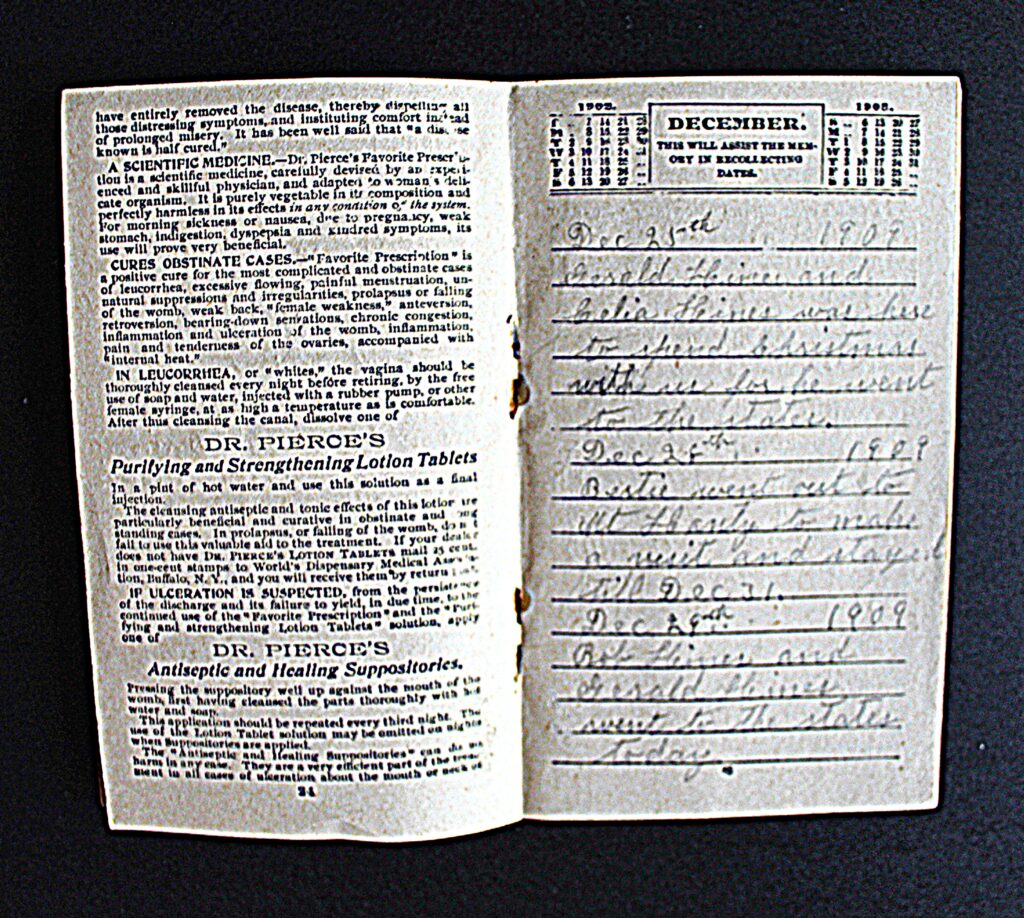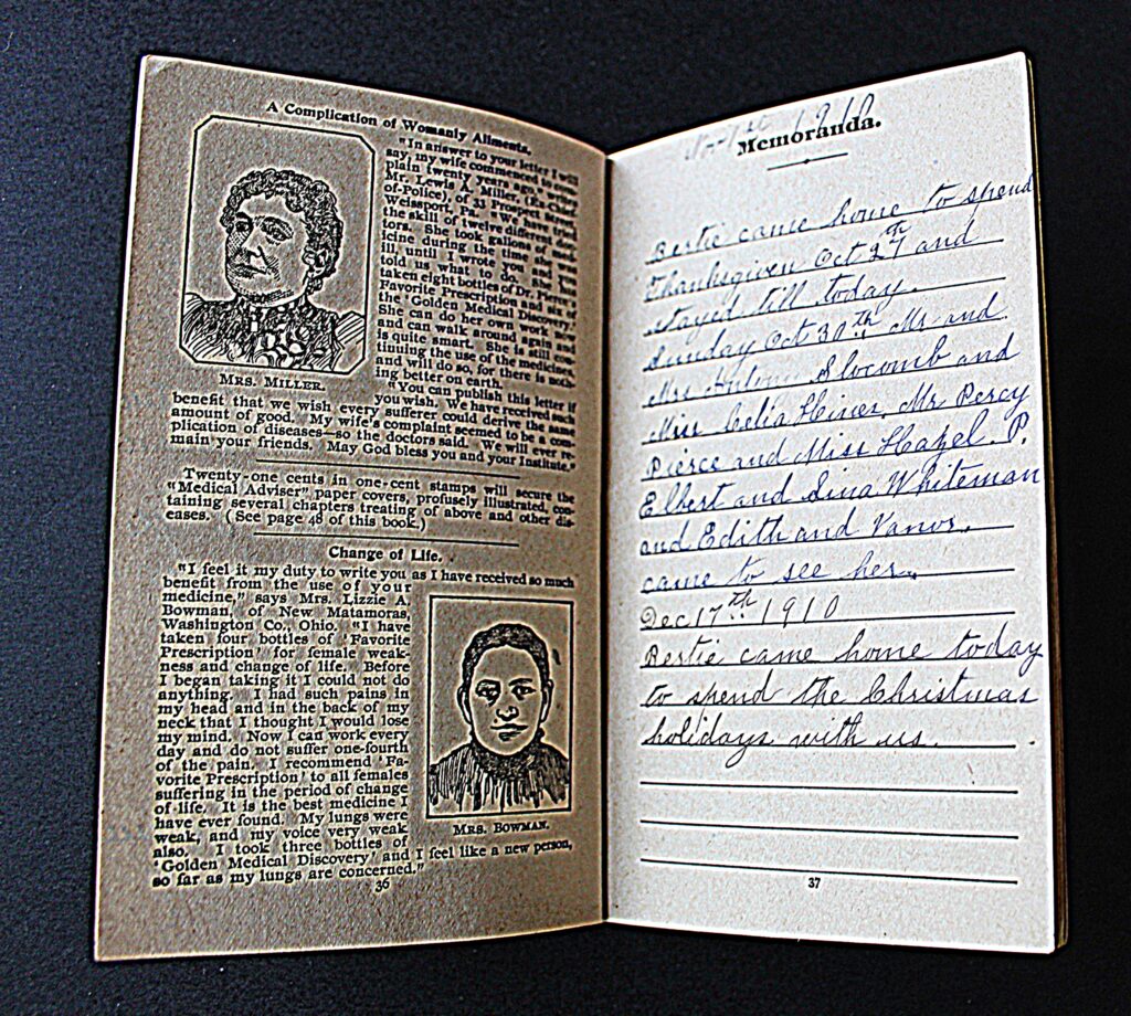 “Nov. 1st 1910 Bertie came home to spend Thanksgiven Oct 27th and stayed till today. Sunday Oct 30th, Mr and Mrs Antony Slocomb and Miss Celia Hines, Mr. Percy Pierce and Miss Hazel. P, Elbert and Lina Whiteman and Edith and Vanor, came to see her; Dec 17th 1910 Bertie came home today to spend the Christmas holidays with us.” Last entry.
