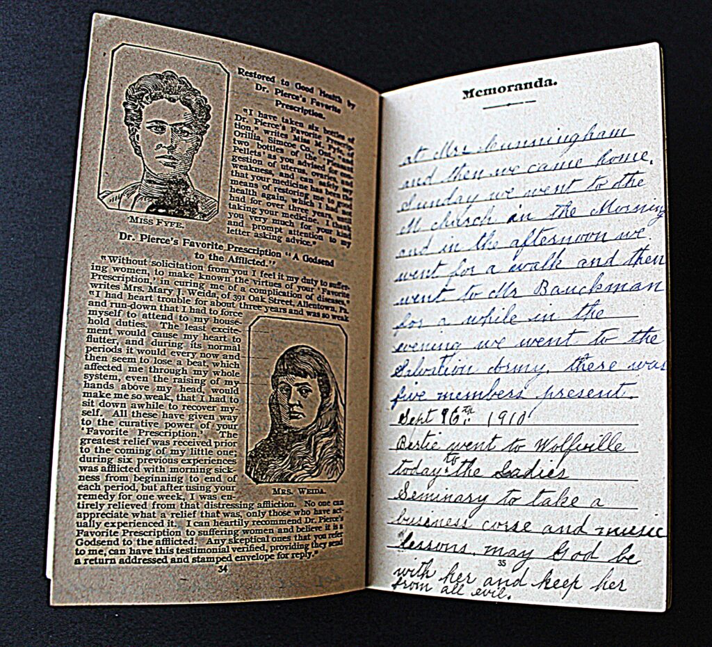 “Aug. 17th 1910 Mamma took Bertie and me out to Bridgetown today, we was to Mr. Bauckman to our dinner and then we was doing our trading till supper time and then we went to Mrs. Cunningham and got our supper and stayed all night and the next evening we went to the S. Army the drum made my head ache and when they sang they kept no tune but sang with all there might. We went back to Mr. Cunningham and stayed all night and the next day and in the afternoon about 5 o’clock we started for Mr. Gauis Eisner it had rained all day so we could not go befor, we stayed there till the next afternoon, I had a lovely time, they did every thing they could to make us enjoy ourselves. in the afternoon we went to Mr. McLeod and in the evening we went to the S. A. we stayed to Mr. McLeod till Monday afternoon and then Beatrice came for us we had our supper at Mrs. Cunningham and then we came home. Sunday we went to the M church in the morning and in the afternoon we went for a walk and then went to Mr. Bauckman for a while in the evening we went to the Salvation Army. there was five members present; Sept. 16th 1910 Bertie went to Wolfville today to the Ladies Seminary to take a business corse and music lessons. May God be with her and keep her from all evil.”