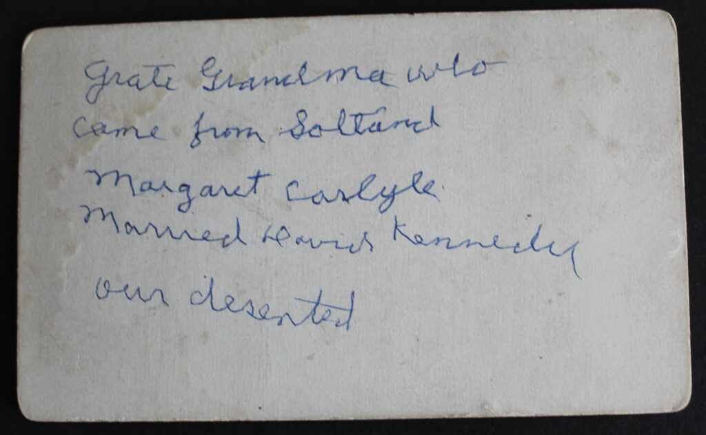 Caption: Written on back: “Great grandma who came from Scotland, Margaret Carlyle married David Kennedy our desented”